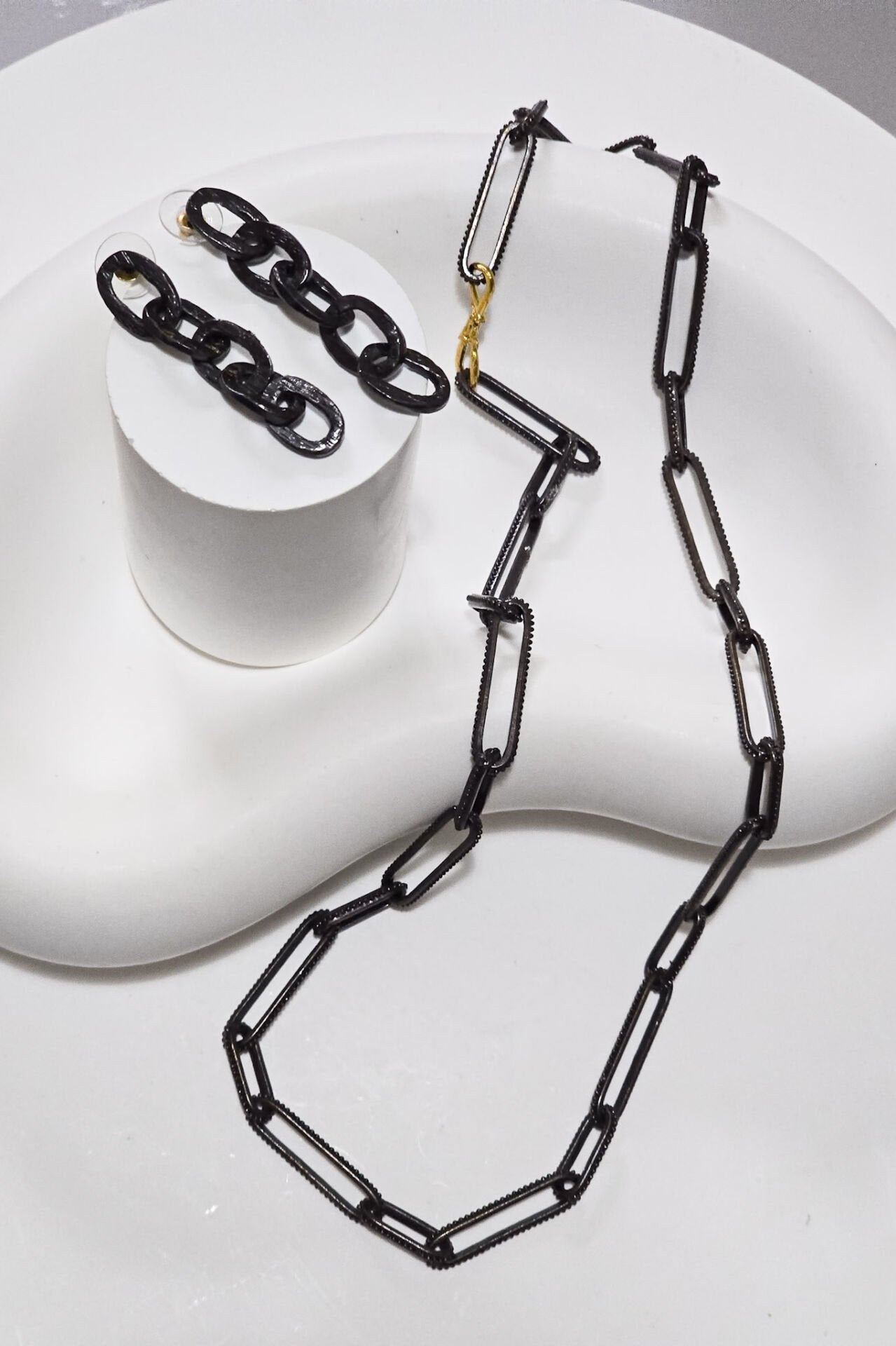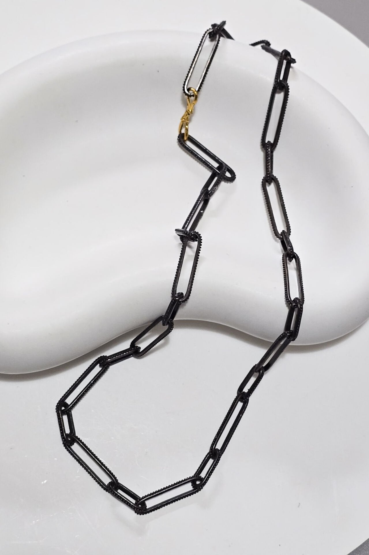 "Endüstriyel dokuların siyahın mat asaletiyle buluştuğu bu kolye, şehirli stilinize güçlü ve modern bir imza katacak.