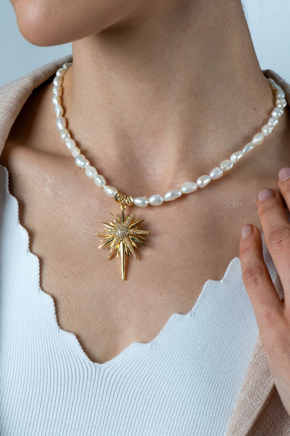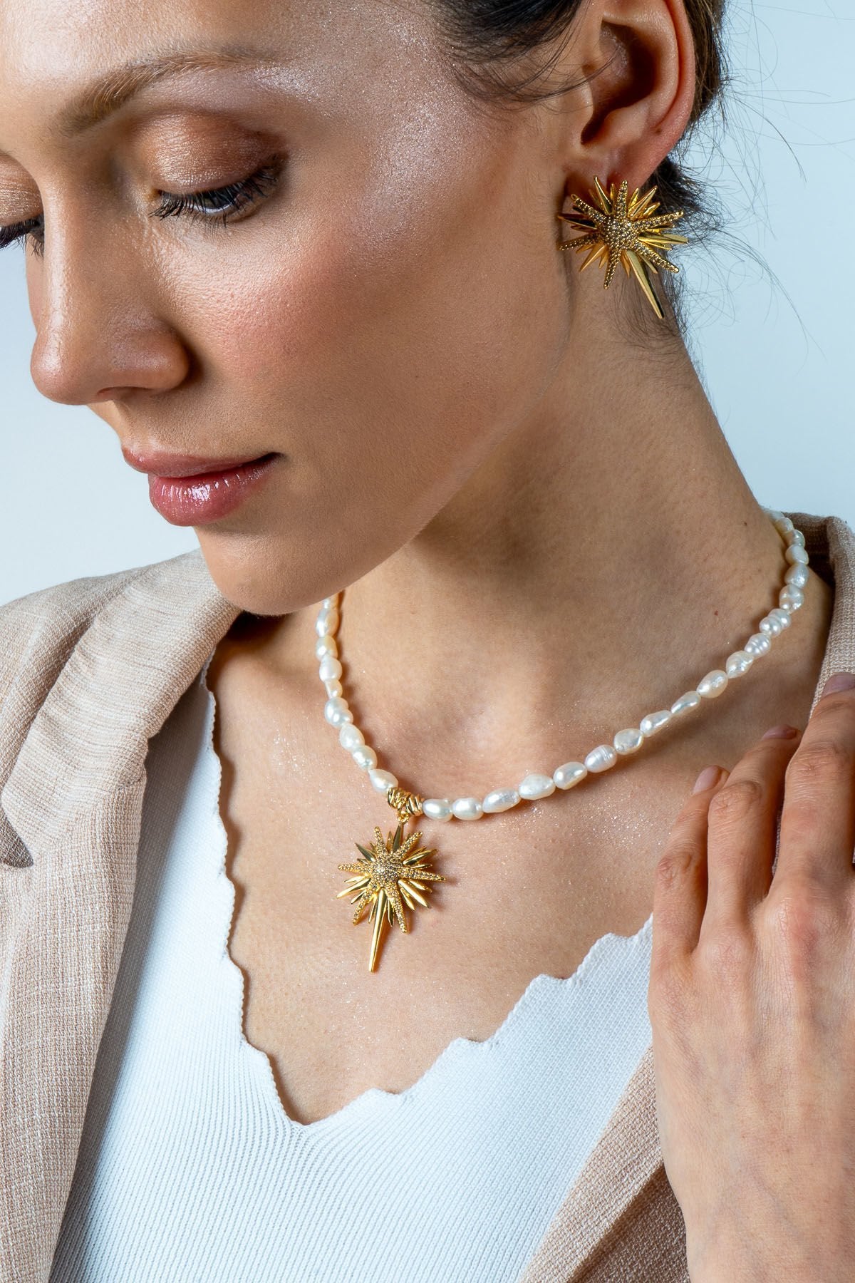 İncili Kuzey Yıldızı Kolye Küpe Set Siyah