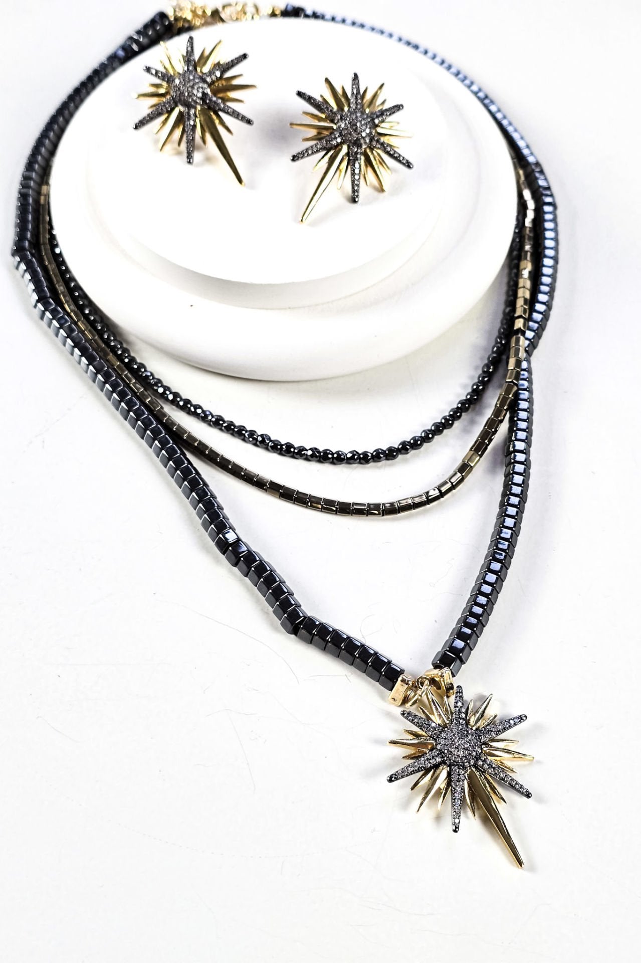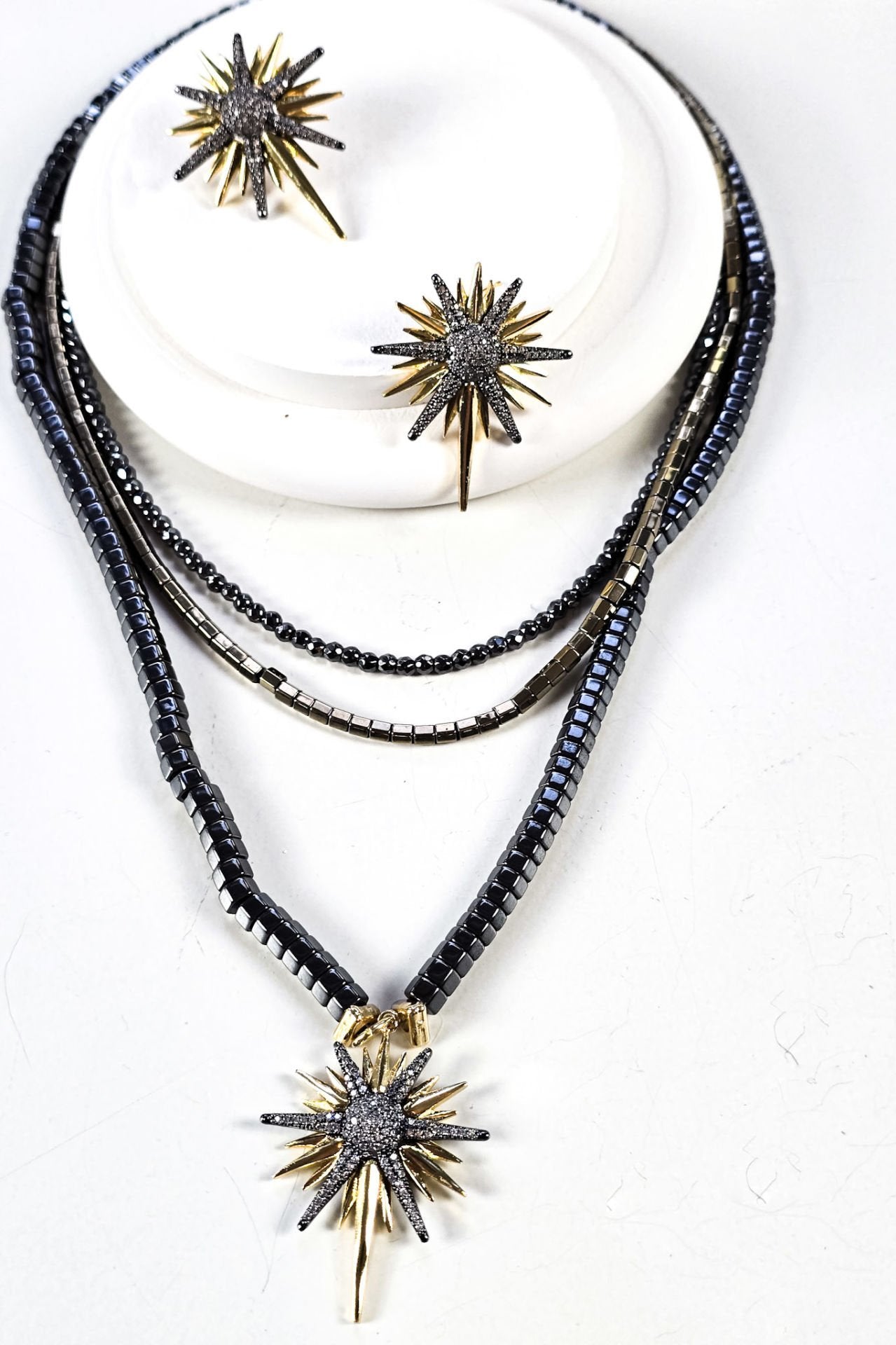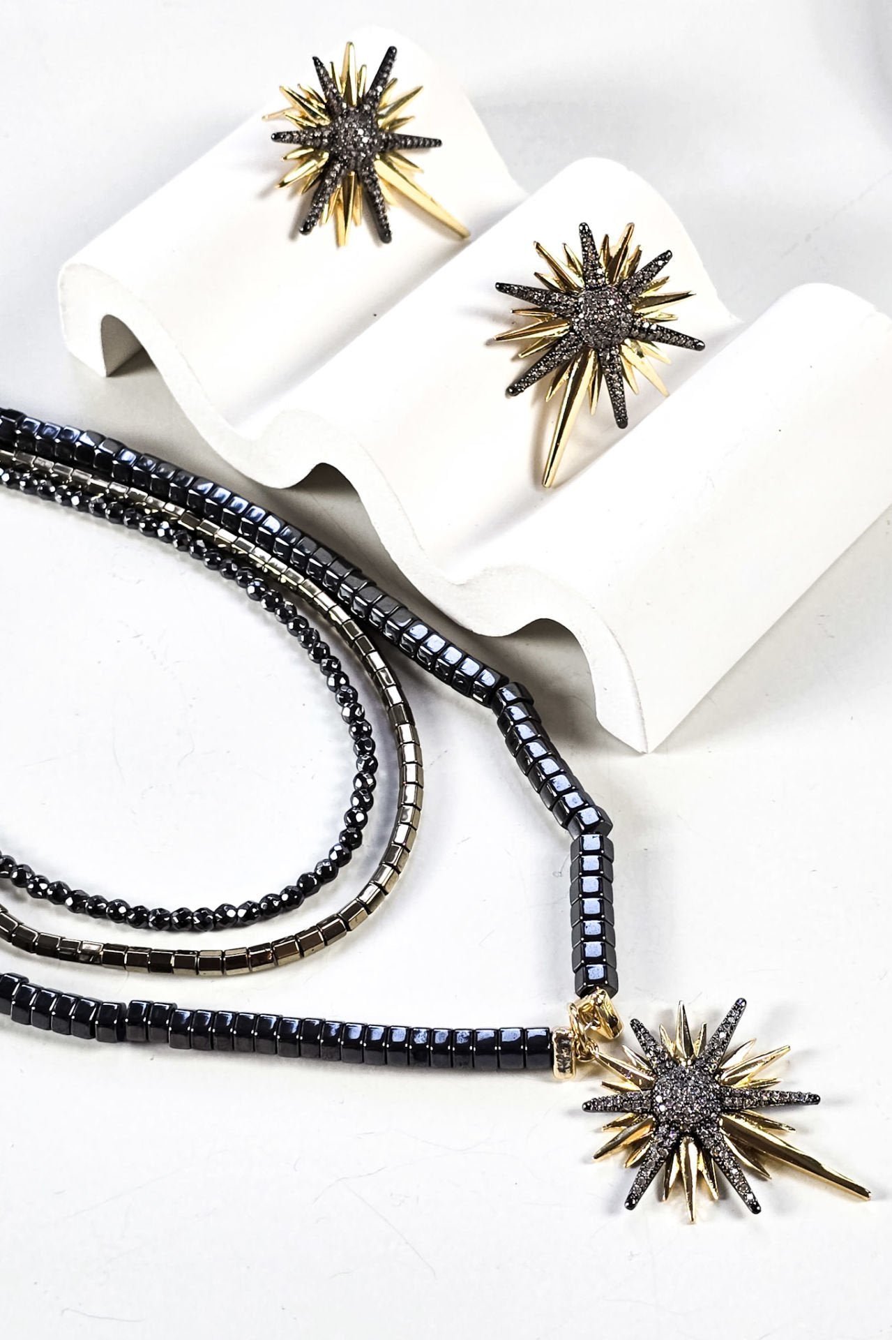 • Küpe zirkon taşlarla, kolye hematit taşlarla süslenmiştir.