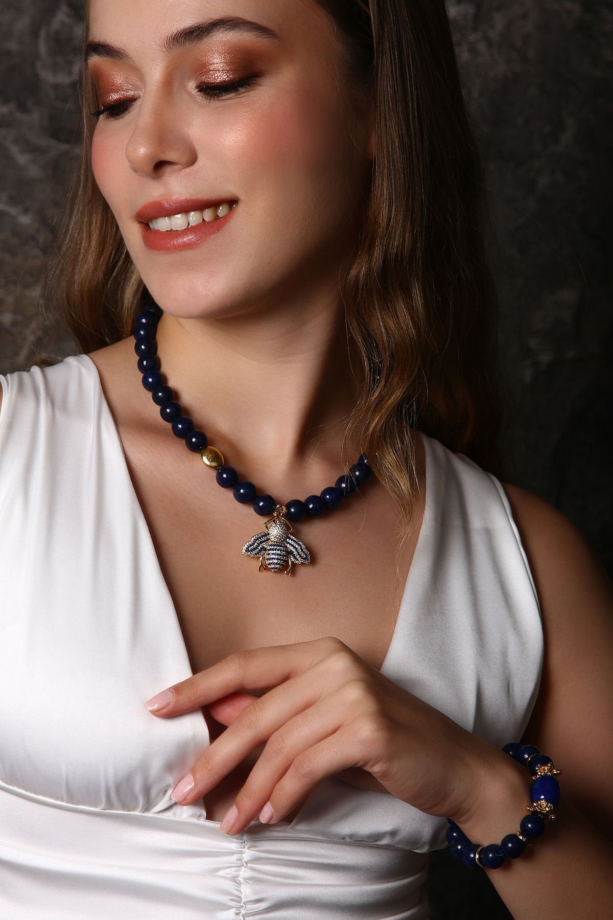 - Kolyede ve bileklikte Lapis doğal taşı kullanılmıştır.